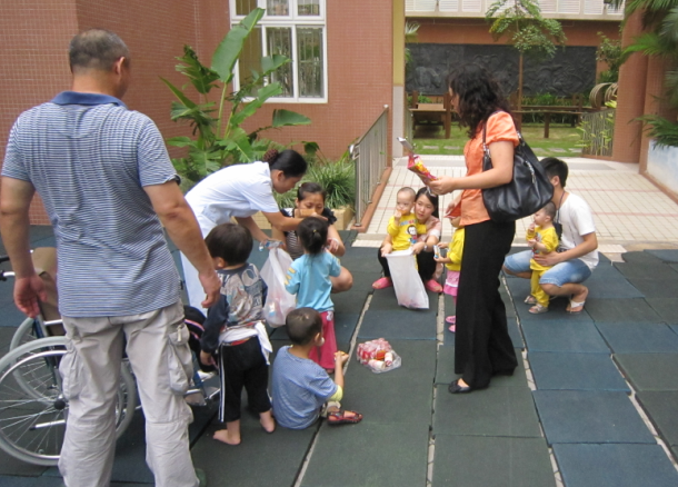 隨后,黃老師帶我們參觀了陽光幼兒園。小朋友正好在上戶外活動課,運動場上大概有10多個孩子,他們有的在玩蕩秋千,有的玩滑梯,有的在玩游戲,顯得十分開心……旁邊有一位男老師和女老師還有一位保育員在陪護,還有一位大伯,是一名熱心的義工,在看護一位坐在輪椅上的腦癱兒童。孩子們看到我們來了,十分開心也很懂禮貌,紛紛叫道:“阿姨好!”我們也把手上帶來的糖果、餅干等分發(fā)給他們??吹竭@些孩子們,我們的問題一下多了起來,黃老師一一為我們做了解答,她介紹:“這些孩子有的是嚴重的地中海貧血癥、有的是先天性心臟病、有的是唐氏綜合癥,他們從小被父母遺棄,由福利院撫養(yǎng)長大。目前,幼兒園最小的孩子才10多天大,所以保育員們都需要24小時值班,晚上起來為孩子們沖奶粉、換尿布。醫(yī)院也配置了醫(yī)務(wù)室,為孩子們做康復(fù)治療。幼兒園也會定期帶孩子們到戶外活動,比如10月份將組織去海濱公園……”