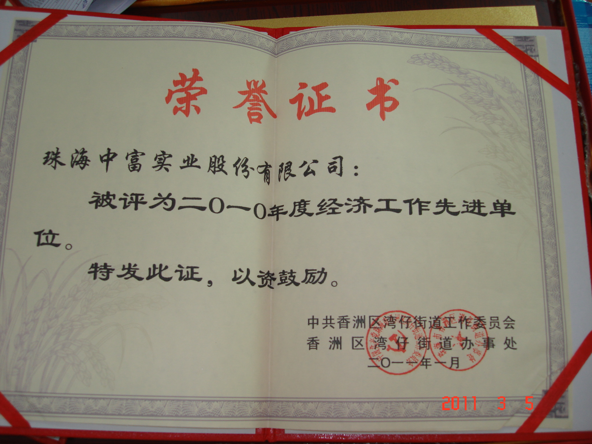 2011年剛邁入新的起點,珠海中富喜訊不斷傳來,先后被評為“2010年度經(jīng)濟工作先進單位”和“2010年度安全生產(chǎn)工作先進單位”。支持中心人事部的曾思明和張華芬同志也分別榮獲“珠海保稅區(qū)2010年度安全生產(chǎn)工作先進個人”和“珠海保稅區(qū)2010年度勞動保障監(jiān)察工作先進個人”。